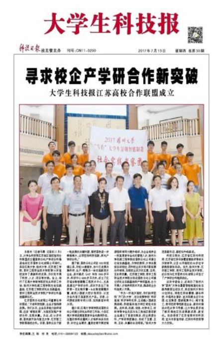 7月8日,大学生科技报江苏地区高校宣传合作联盟成立暨雪豹日化产学研合作推进会在江苏雪豹日化有限公司举行。来自江南大学、扬州大学、江苏理工学院、常州工程职业技术学院等10所高校发布了最新科研成果,并分别开展了科技、人才、项目等对接。会上,举行了江南大学商学院研究生科研工作站、扬州大学机械工程学院社会实践基地、江苏理工学院研究生实践基地、常州工程职业技术学院产学研合作基地揭牌仪式。