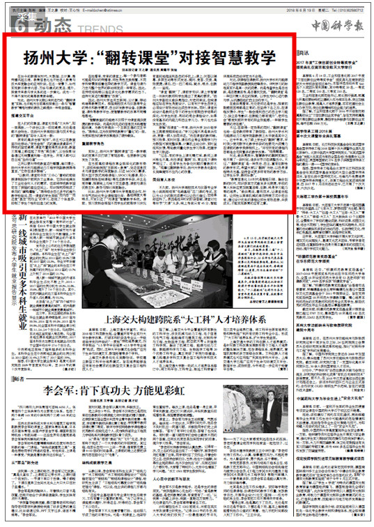 “过去,有的学生上课无精打采,教师上课兴致也不高,而当课堂‘翻转’后,常出现下课铃声响过了,还有学生为争论问题拦着教师不放。”观摩过翻转教学后,扬州大学教务处副处长吴峰掩饰不住内心的欣喜。