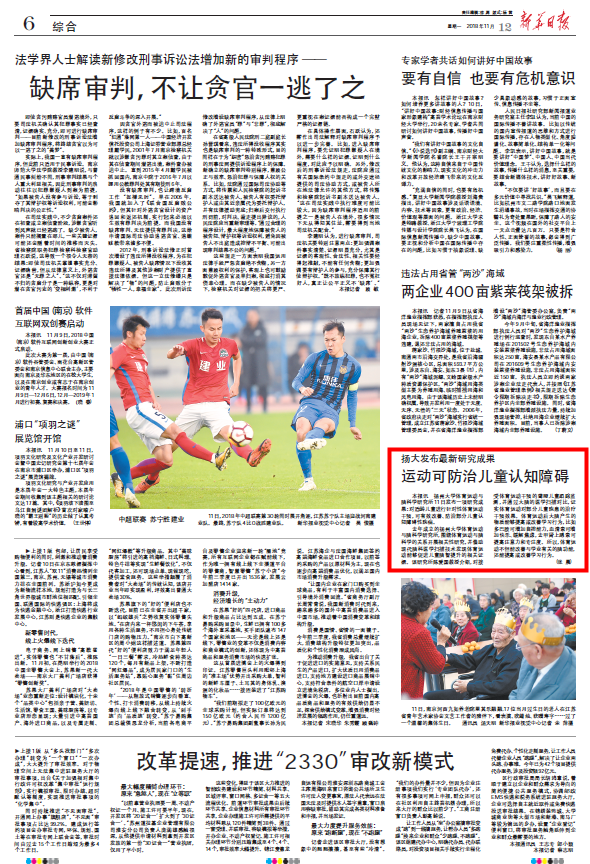扬州大学体育运动与脑科学研究所11日发布一项研究成果:对适龄儿童进行针对性体育运动干预,可有效改善、防治部分儿童认知障碍性疾病。