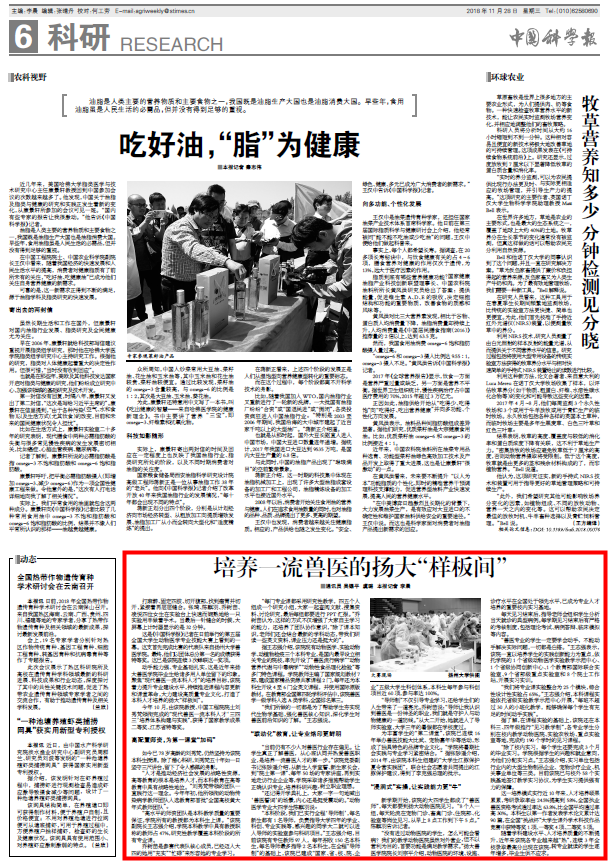 今年10月,由该院教授、中国工程院院士刘秀梵领衔完成的“现代兽医一流本科人才‘三四三’培养体系构建与实践”,获得了国家教学成果二等奖、江苏省特等奖。
