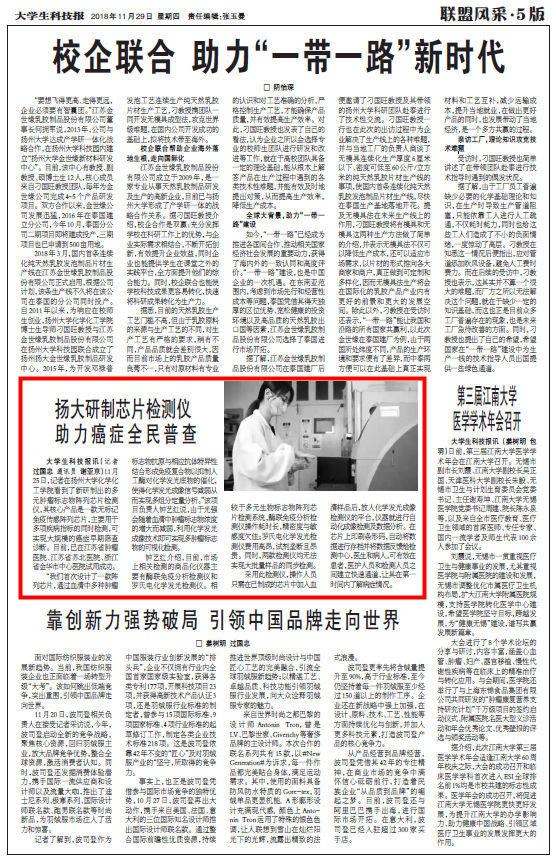 11月25日,记者在扬州大学化学化工学院看到了新研制出的多元肿瘤标志物阵列芯片检测仪,其核心产品是一款无标记免疫传感阵列芯片,主要用于多项疾病指标的同时检测,可实现大规模的癌症早期筛查诊断。目前,已在江苏省肿瘤医院、江苏省苏北医院、浙江省金华市中心医院试用成功。