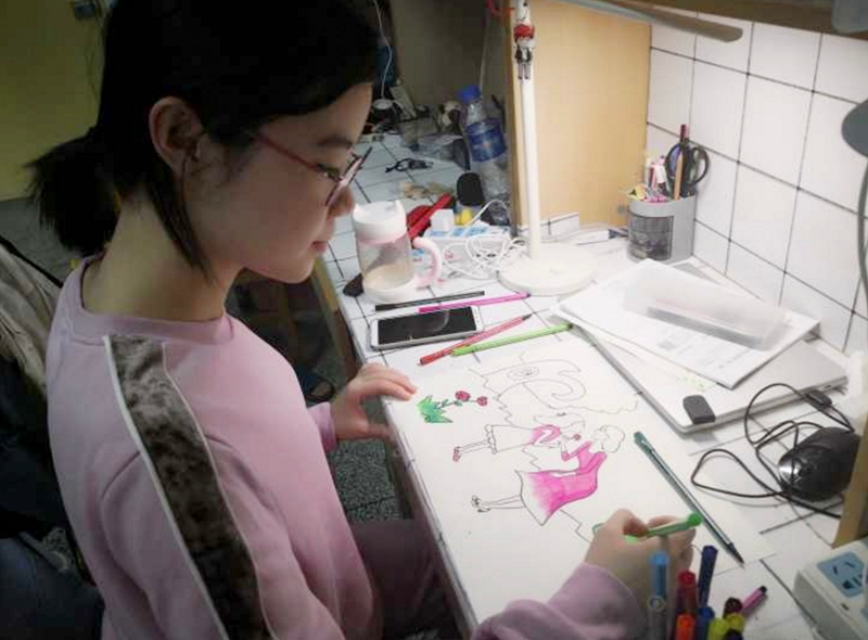 “有时候和妈妈视频通话,总是不经意间发现妈妈头上又新添了一些白发。那时我才意识到,当我们慢慢长大的时候,妈妈正在变老。”温彩霞同学动情地说道。温彩霞同学用素描的方式绘出妈妈送她上学的场景,两个人的背影呈现在画纸上,一个高大坚实,另一个瘦小单薄。温彩霞说:“在画画的过程中,我的脑中浮现了很多和妈妈在一起的场景,这些或许都是平常生活中微不足道的一幕,但在我看来,它们就是‘母爱’的藏身之处。”