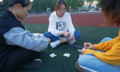 在扬州大学荷花池校区的操场上,只见几位同学围坐一起,他们手里拿着针和线,埋头细心地编织着一个个布袋,将各种花瓣放入袋中,制成花瓣香囊。同学们还玩起了“比香”,将香囊放到对方鼻子下,看谁的香囊更胜一筹。