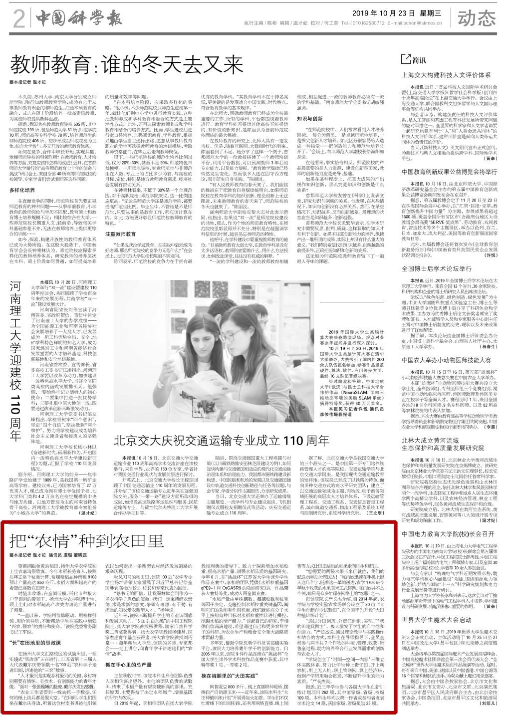 ——《中国科学报》 (2019年10月23日 第2版 动态)
