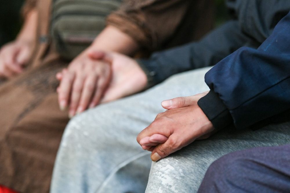 ↑李东明握着父母的手,一家人在出租屋附近的小公园内休息。