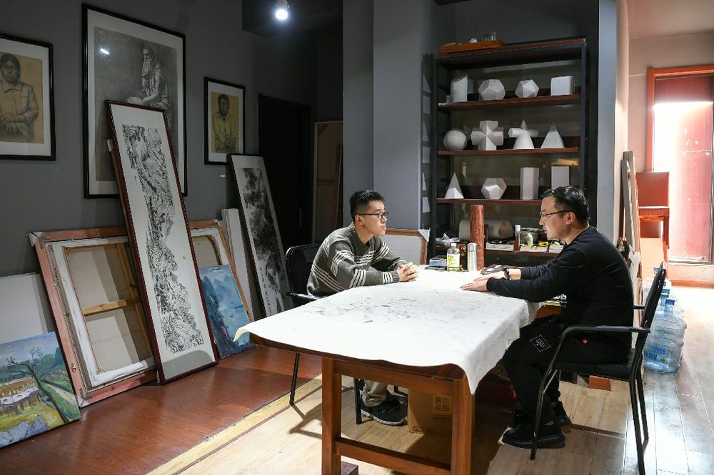 ↑李东明(左)在扬州季林冲画室面试。画室老板季林冲(右)准备为李东明提供一份兼职工作,帮助他继续学业。