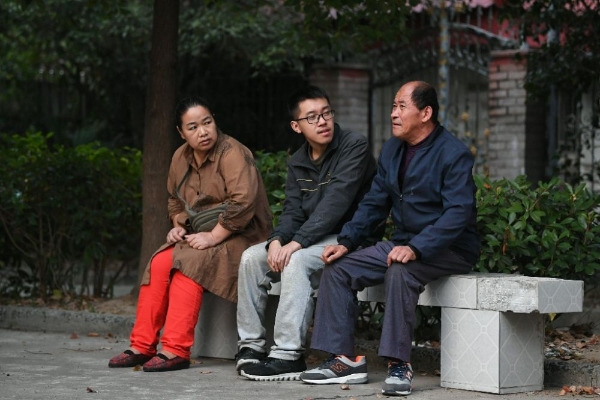 ↑李东明(中)和父母在出租屋附近的小公园内聊天。