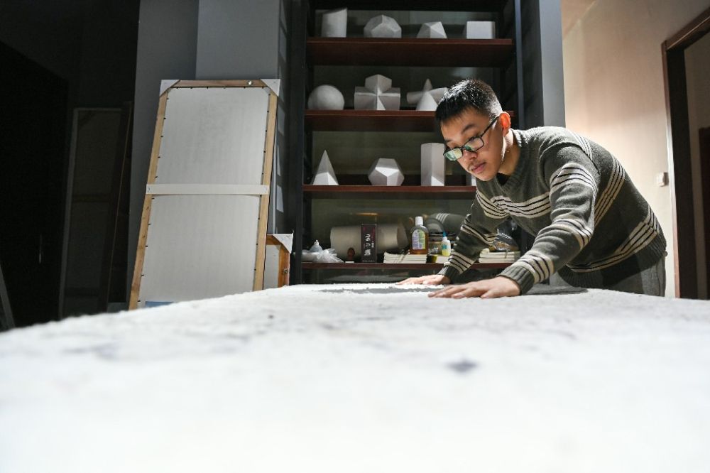 ↑李东明在扬州季林冲画室内整理画室桌面,考研结束后,李东明准备来画室兼职工作。