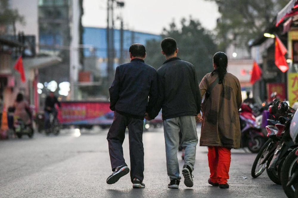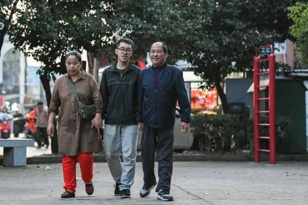 ↑李东明(中)和父母在出租屋附近的小公园内散步聊天。