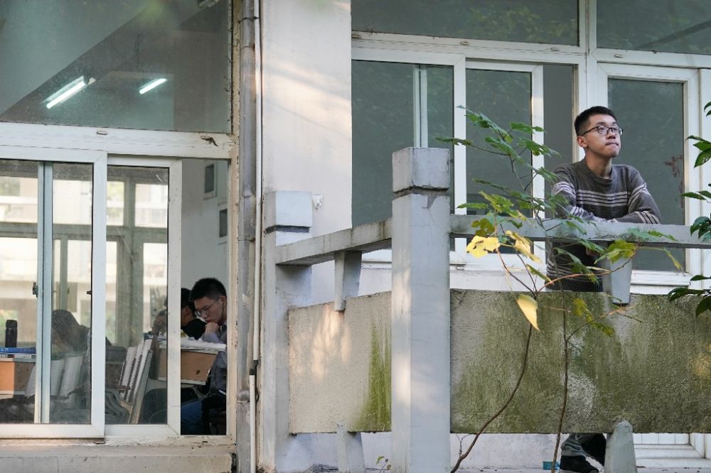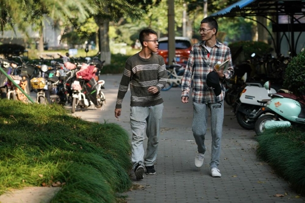 ↑李东明(左)和同学陈安一起去学校自习室学习,路上李东明正在向陈安请教专业课知识。