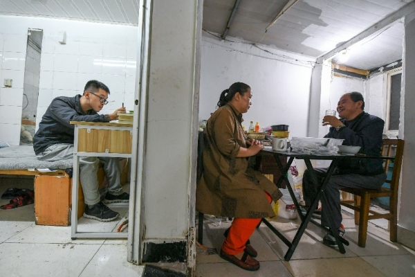 ↑李东明(左一)在出租屋内学习,父亲李清仁(右一)和母亲正在吃晚饭。