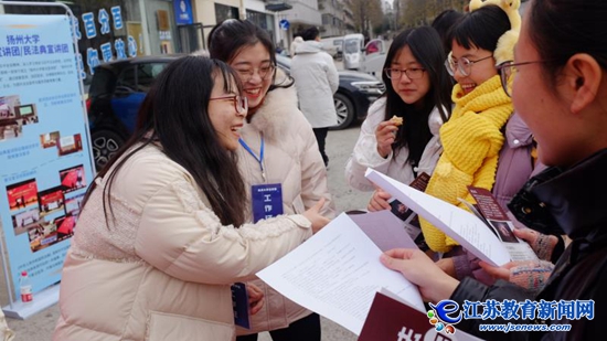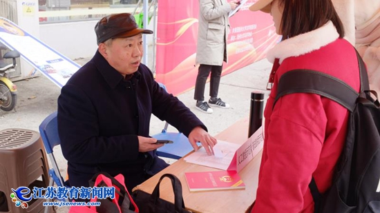 “这是干啥呢?”“今天是宪法日,他们在开展普法宣传呢。”两名驻足的学生说。“同学们,大家好,这里是扬州大学普法宣讲团宪法日快闪普法活动。”主持人的话解开了大家的疑惑。在普法宣传和服务活动现场,记者看到扬州大学“最美教师”、三十年志愿普法的“义工教授”孟咸美老师也在为师生普及宪法知识。从1985年参加工作以来,孟咸美老师就一直致力于普法宣传,最开始是给部队的转业军人培训,普及宪法、刑法、民法的理论知识,为他们日后进入公检法部门工作奠定基础。在宣讲服务中,孟咸美老师认真向咨询的师生讲解宪法知识,提供法律服务,得到了大家的一致赞誉。