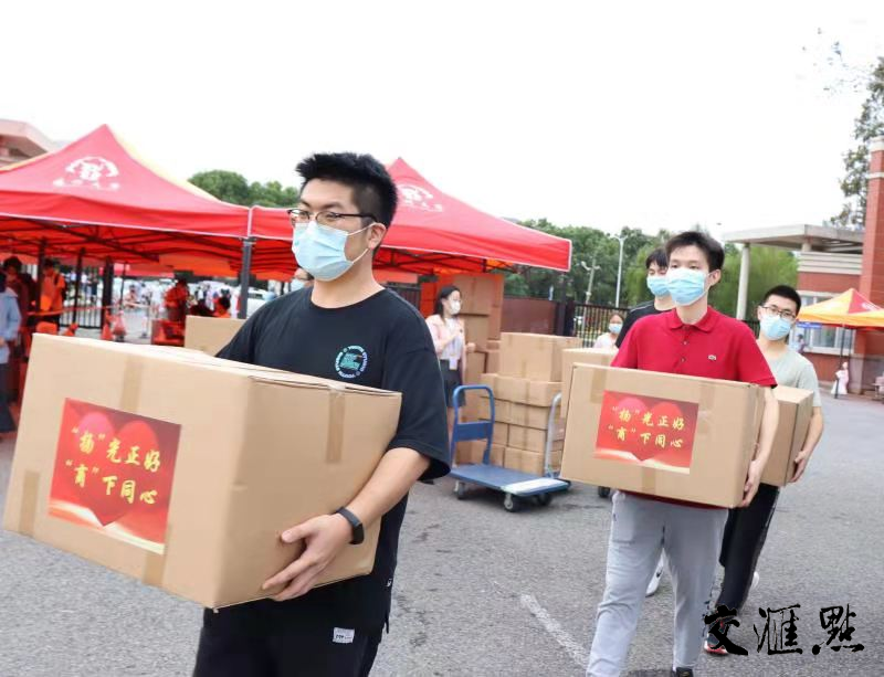 当日,十万只口罩抵达校园,即将为同学们提供十万次“保护”。交接现场,满满当当装着口罩的纸箱一排排整齐叠放着,箱子表面贴着“‘扬’光正好 ‘商’下同心”字样。记者看到,报到现场,急缺口罩的同学已经戴上了“爱心口罩”,一个男生双手竖起大拇指开心地手:“感谢学姐的关怀,好温暖,安全感满满!”