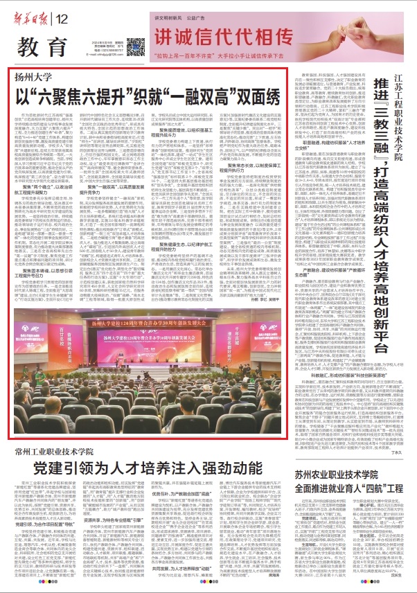 作为首批新时代江苏高校“强基创优”示范高校培育创建单位,扬州大学持续推动党的建设与学校事业发展深度融合,大力实施“六聚焦六提升”工程,全力推进创建任务“40条”,聚力构造“6+6+40”党建工作体系,构建创新创优强劲引擎,激发高质量党建引领高质量发展新动能。学校步入“双省部”共建新征程,连续五年荣获省属高校高质量发展综合考核第一等次,一大批创新创造成果争相涌现。当前,学校深入学习贯彻习近平总书记关于党的自我革命的重要思想,推动全面从严治党向纵深发展,以高质量党建为引领,纵深推进“第三次创业”,奋力谱写高水平研究型大学现代化建设新篇章。